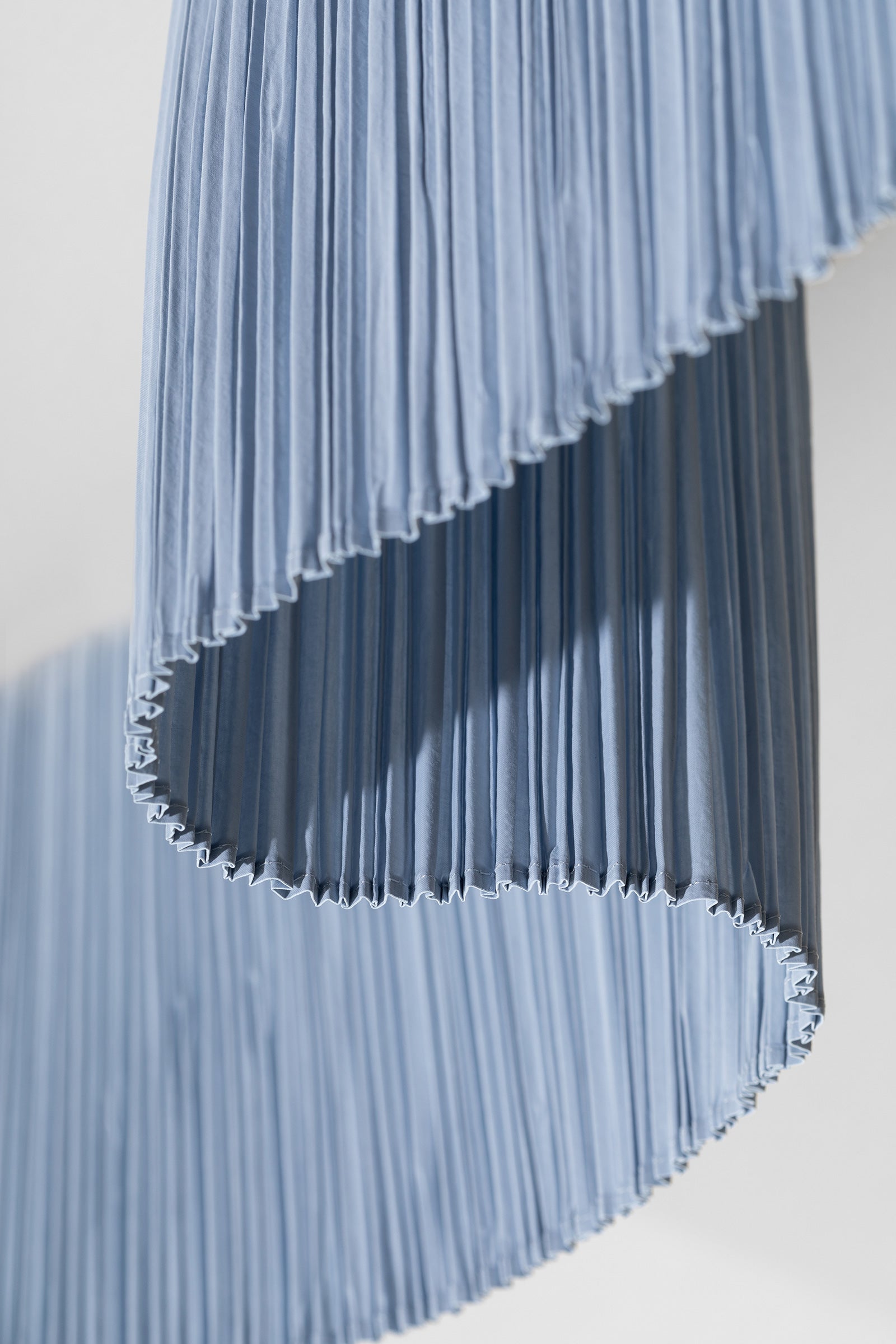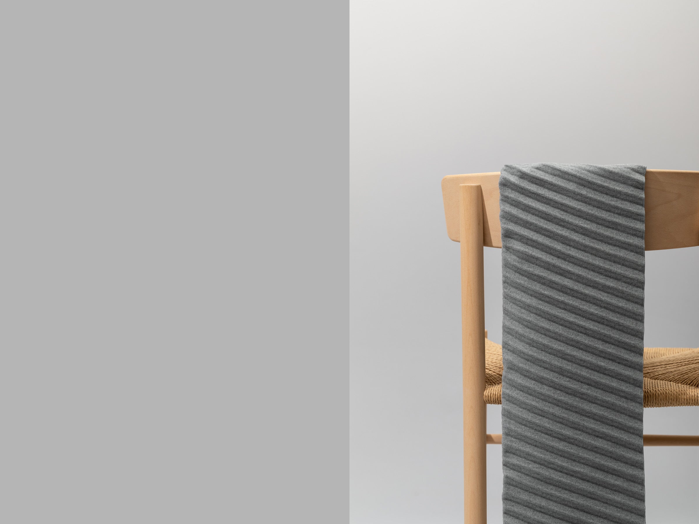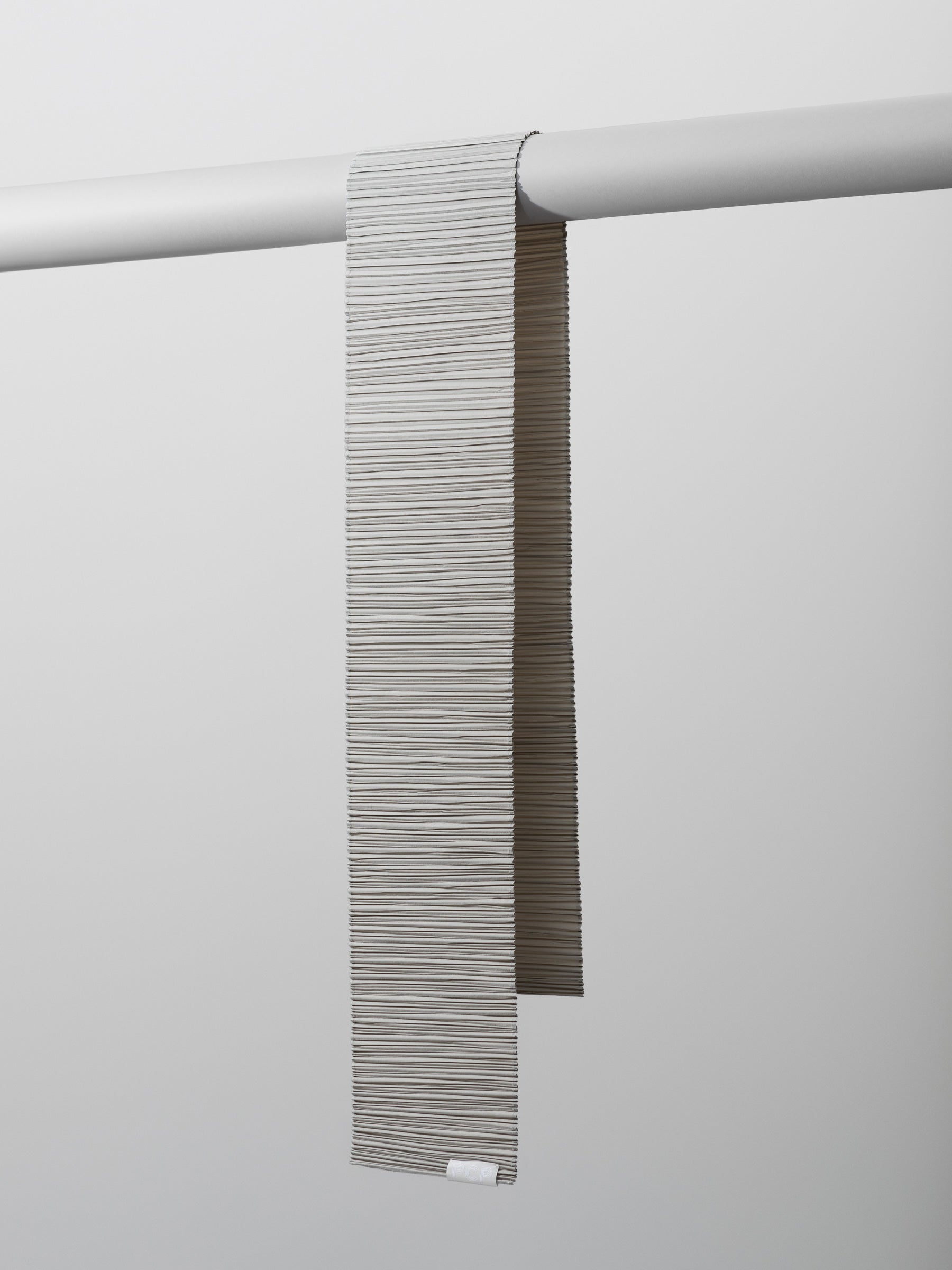 プリーツ加工から生まれる凹凸形状を「柄」と捉えるだけでは無く機能として捉え、「伸縮性」と「空気の層」に着目。「伸縮性」は製品サイズの最小化/最大化を生み出し、首に巻けるマフラーサイズからスカーフのように広げ、肩掛けなどに使用する事が可能。シチュエーションに合わせた用途で使用することが可能になります。